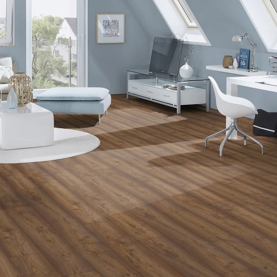 It has a v-groove on all four sides that gives a realistic wood floor appearance. A medium embossed surface gives it an authentic textured finish, while the oak colour combines a dark brown with warm tones.